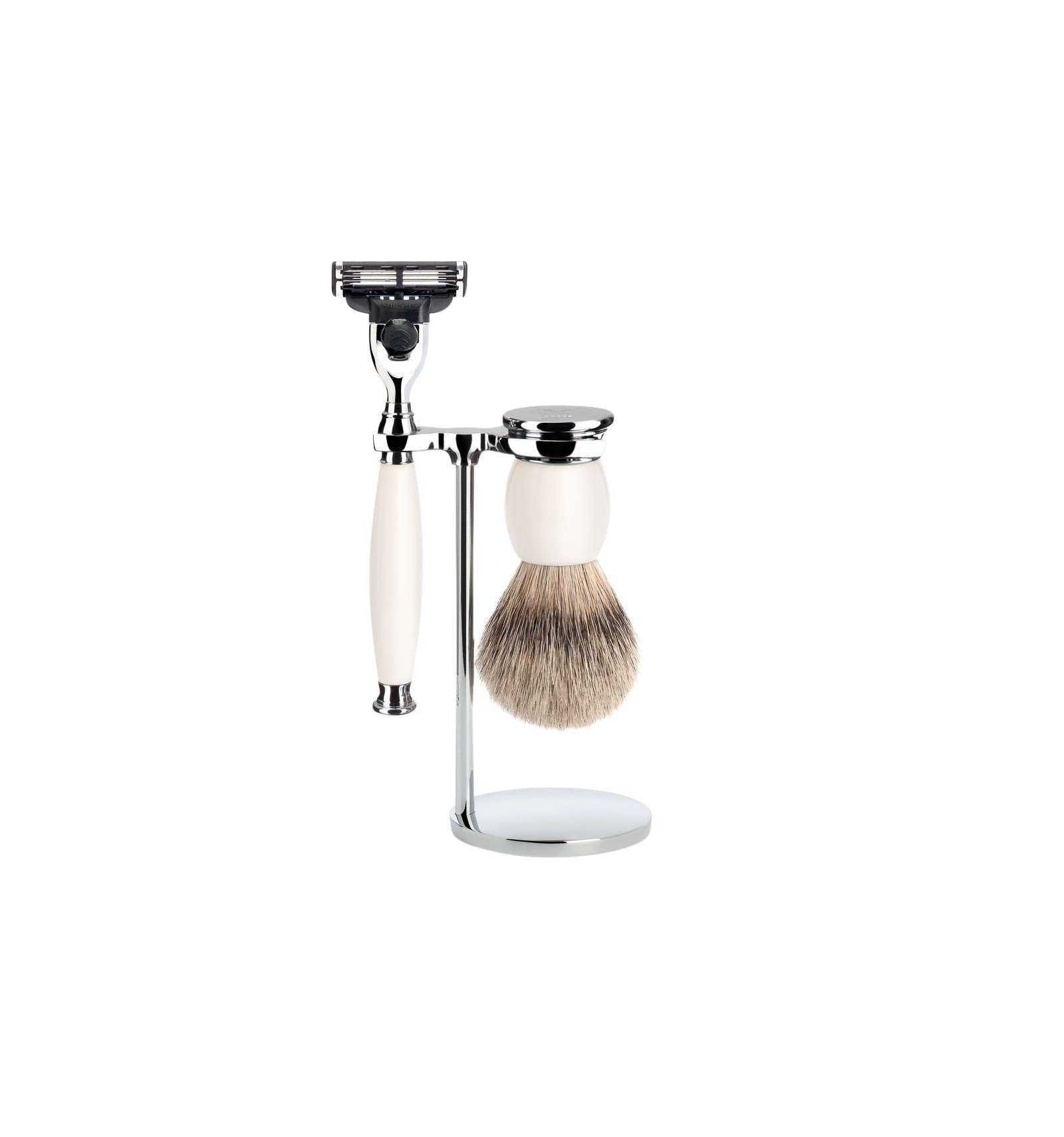 La línea Sophist demuestra la experiencia, la elegancia y la perfección de la casa Mühle. Su diseño, la armonía entre maquinilla y brocha, y la calidad de sus materiales hacen de este set de afeitado todo un ejemplo de trabajo bien realizado. El pelo es de tejón punta de plata (Mühle). Los mangos están realizados en porcelana blanca. Los remates en cromados realzan más la belleza de estas piezas.