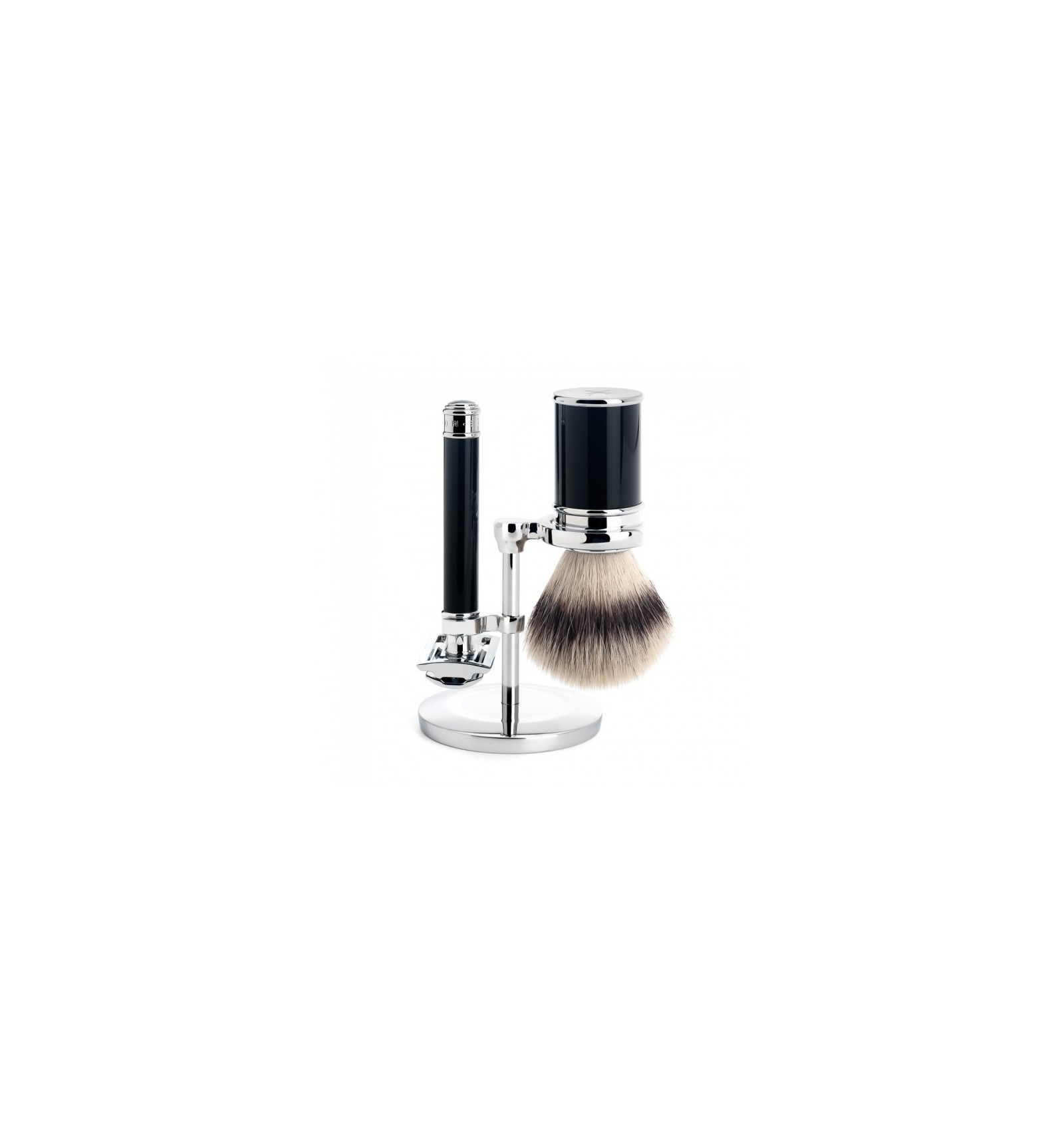 En este set de afeitado clásico el pelo sintético de Muhle se viste de gala con este bonito mango de color negro y toques cromados, acompañada de la maquinilla de afeitar peine cerrado R 106; ambas perfectamente soportadas en el bonito y recogido soporte RHM SR SET