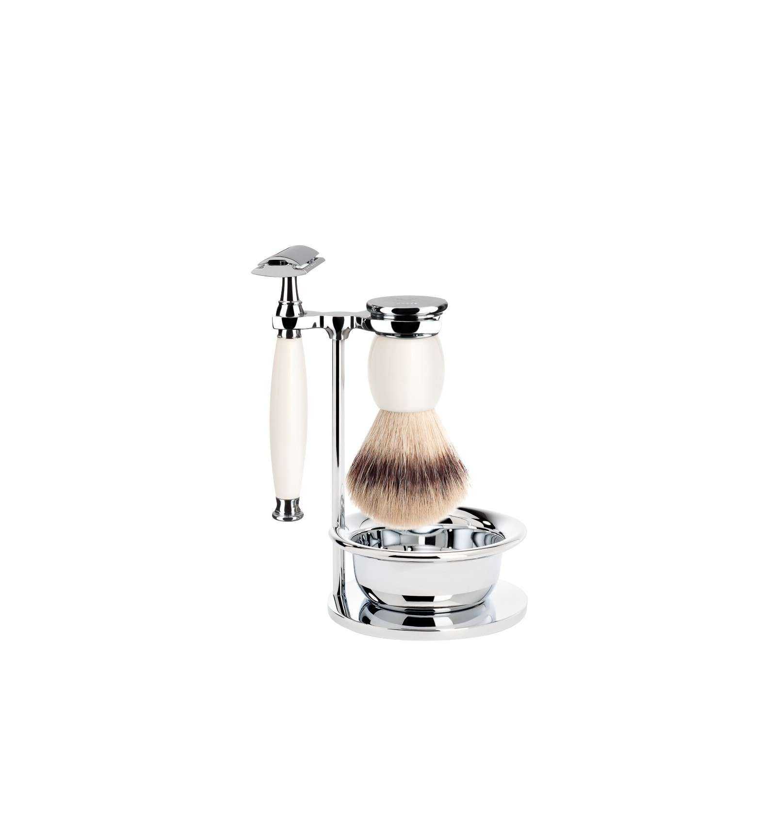 La línea Sophist demuestra la experiencia, la elegancia y la perfección de la casa Mühle. Su diseño, la armonía entre maquinilla y brocha, y la calidad de sus materiales hacen de este set de afeitado todo un ejemplo de trabajo bien realizado. El pelo es de tejón punta de plata (Mühle). Los mangos están realizados en porcelana. Los remates en cromados realzan más la belleza de estas piezas.